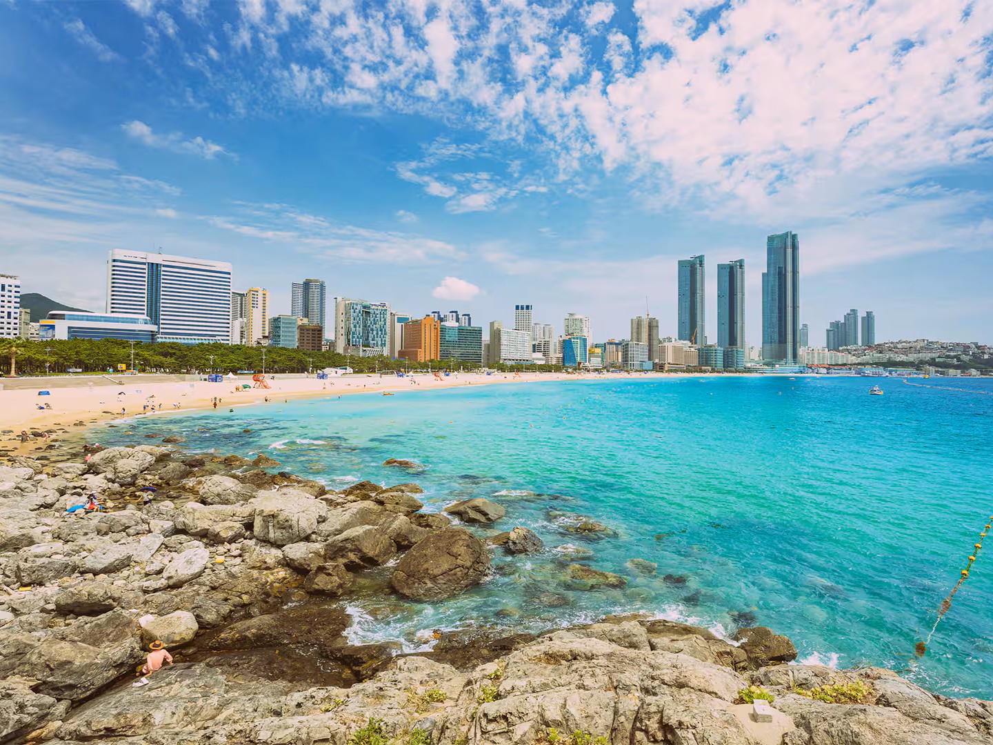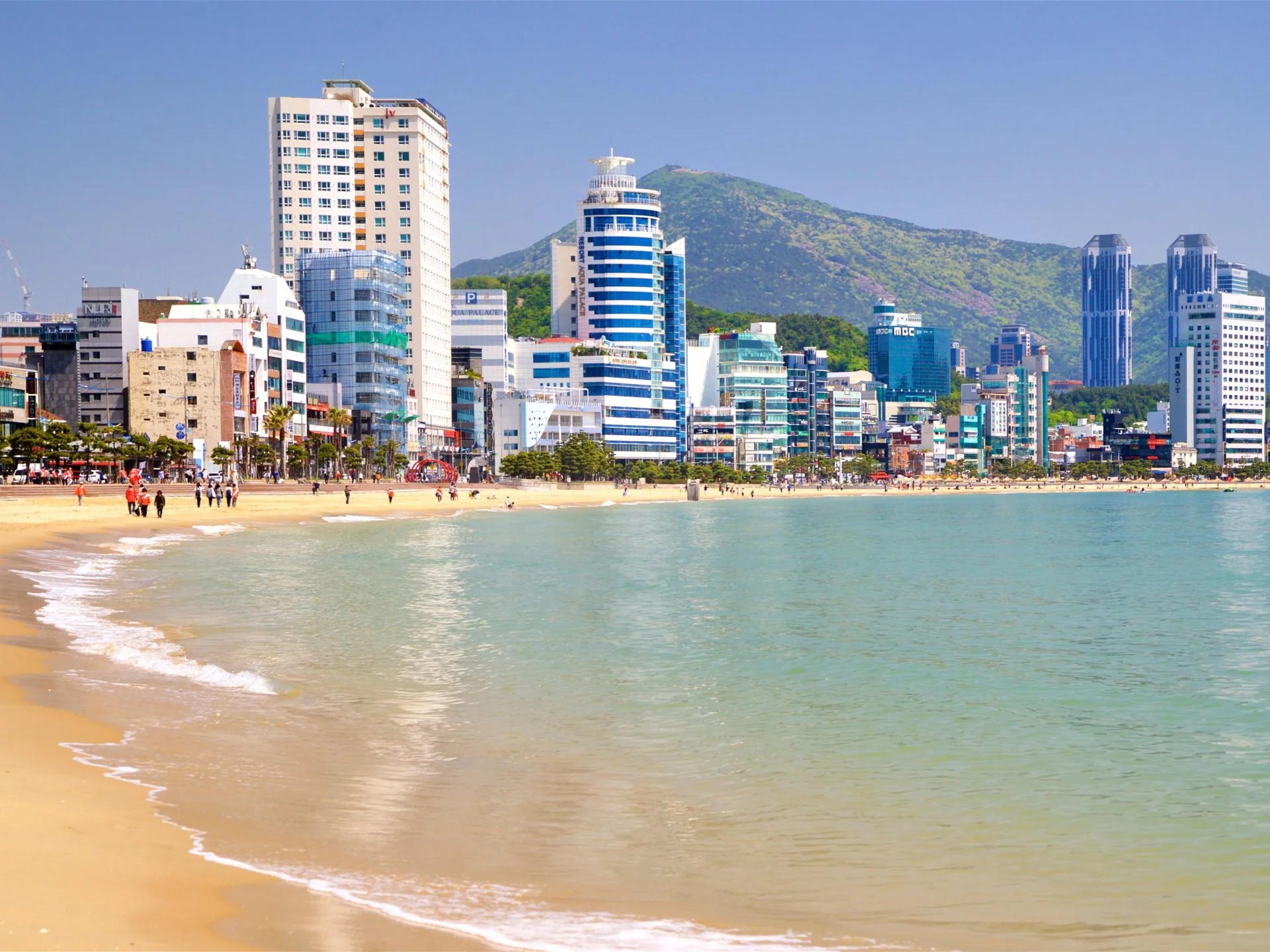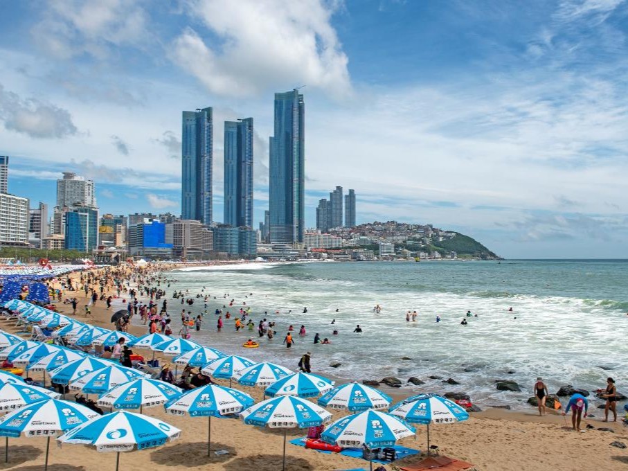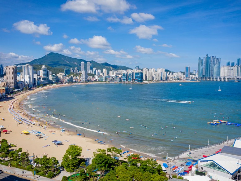La Playa Haeundae es un tramo de 1.5 kilómetros de arena blanca en la costa sureste de Busan, considerada la playa más famosa de Corea del Sur. Atrae a millones de visitantes para nadar, tomar el sol y disfrutar de un paisaje urbano junto al mar con rascacielos, hoteles de lujo y una vibrante vida nocturna.